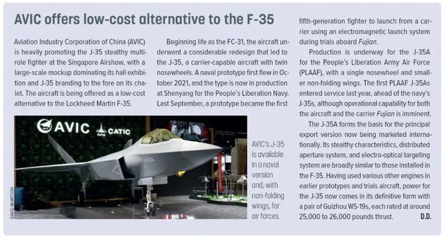 从西方媒体基于新加坡航展宣传刊物上对歼-35A型战斗机的描述,歼-35A型战斗机在品牌宣传上,被称为洛克希德-马丁公司的所谓“低成本替代”。呃……这个描述不清楚是咱们真的在会刊上这么写的,还是外媒这么传的。